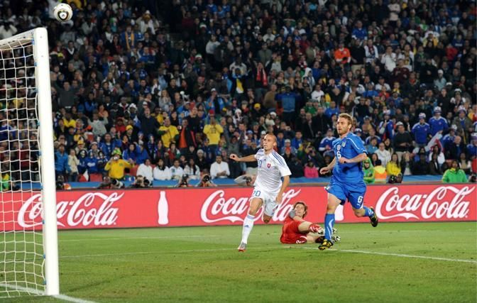 epa02220167 Italian goalkeeper Federico Marchetti (C) and teammate Daniele de Rossi (R) are beaten by Slovakia's Kamil Kopunek as Slovakia goes 3-1 up during the FIFA World Cup 2010 group F preliminary round match between Slovakia and Italy at Ellis Park stadium in Johannesburg, South Africa, 24 June 2010. EPA/GERRY PENNY Please refer to www.epa.eu/downloads/FIFA-WorldCup2010-Terms-and-Conditions.pdf