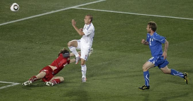 Slovakia's Kamil Kopunek, center, scores his side's third goal past Italy goalkeeper Federico Marchetti, left, during the World Cup group F soccer match between Slovakia and Italy at Ellis Park Stadium in Johannesburg, South Africa, Thursday, June 24, 2010. Running right is Italy's Daniele De Rossi. (AP Photo/Michael Sohn)