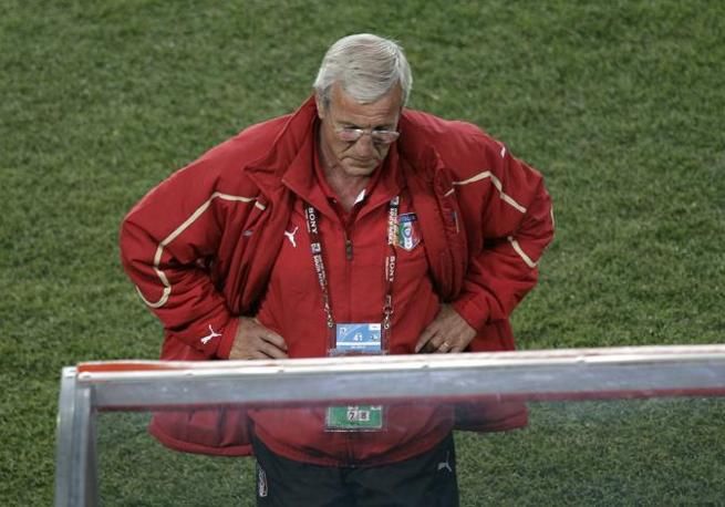 Italy head coach Marcello Lippi reacts at the end of the World Cup group F soccer match between Slovakia and Italy at Ellis Park Stadium in Johannesburg, South Africa, Thursday, June 24, 2010. Slovakia won 3-2 and advances to the round of 16. (AP Photo/Michael Sohn)