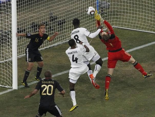 Germany's goalkeeper Manuel Neuer (R) makes a save next to Ghana's Jonathan Mensah (2nd R) and John Pantsil (3rd R) during the 2010 World Cup Group D soccer match at Soccer City stadium in Johannesburg June 23, 2010. REUTERS/Ivan Alvarado (SOUTH AFRICA - Tags: SPORT SOCCER WORLD CUP)