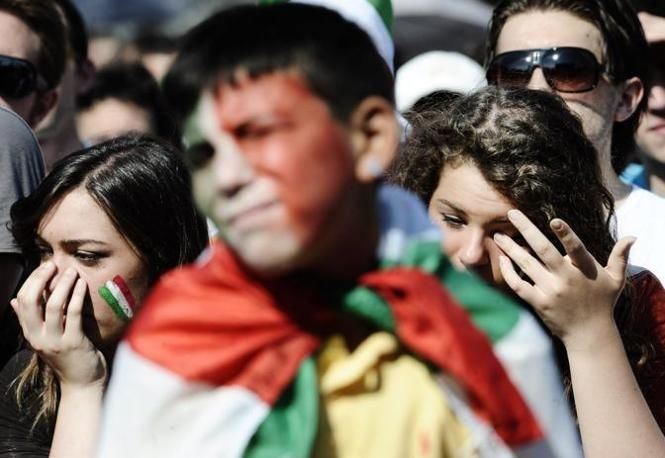 CORRECTS PHOTOGRAPHER NAME AND CITY - Italian soccer fans react during the public viewing of the group F World Cup soccer match between Italy and Slovakia, in Naples, Italy, Thursday, June 24, 2010. (AP Photo/Salvatore Laporta)