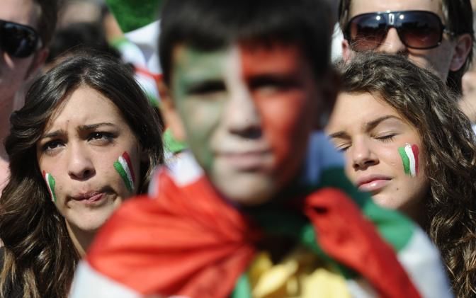 CORRECTS PHOTOGRAPHER NAME AND CITY - Italian soccer fans react during the public viewing of the group F World Cup soccer match between Italy and Slovakia, in Naples, Italy, Thursday, June 24, 2010. (AP Photo/Salvatore Laporta)