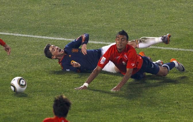 Spain's Fernando Torres and Chile's Arturo Vidal (R) fall onto the pitch during a 2010 World Cup Group H match at Loftus Versfeld stadium in Pretoria June 25, 2010. REUTERS/David Gray (SOUTH AFRICA - Tags: SPORT SOCCER WORLD CUP)