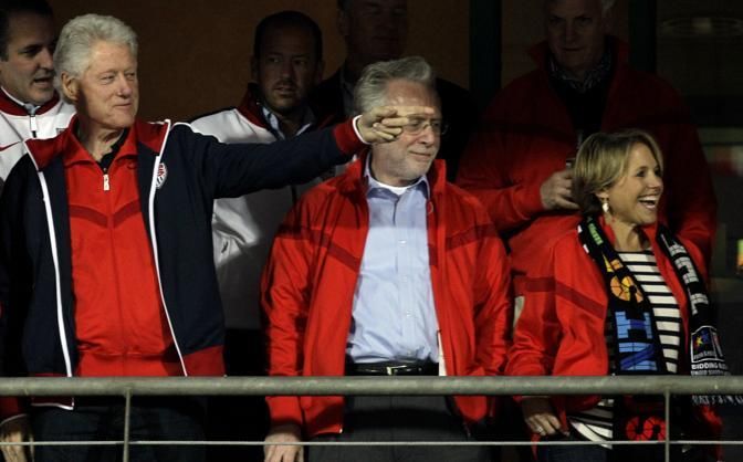 Former US President Bill Clinton, left, CNN's Wolf Blitzer, center, and Katie Couric, right, wait for the start of the World Cup round of 16 soccer match between the United States and Ghana at Royal Bafokeng Stadium in Rustenburg, South Africa, Saturday, June 26, 2010. (AP Photo/Elise Amendola)
