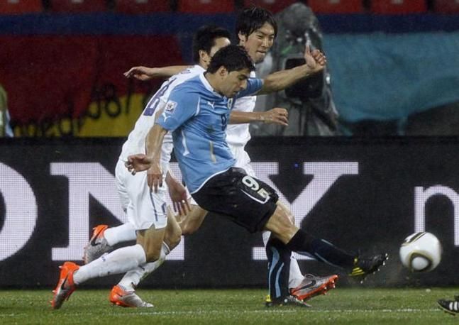 Uruguay's Luis Suarez (front) scores a second goal during the 2010 World Cup second round match against South Korea in Port Elizabeth June 26, 2010. REUTERS/Lee Jae-Won (SOUTH AFRICA - Tags: SPORT SOCCER WORLD CUP)