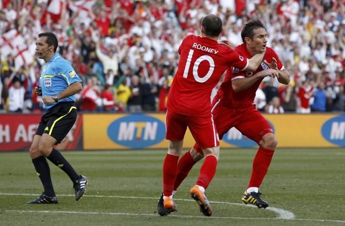 England's Frank Lampard (R) celebrates with team mate Wayne Rooney after a shot at goal during a 2010 World Cup second round soccer match against Germany at Free State stadium in Bloemfontein June 27, 2010. Video replay showed that Lampard's shot at goal had crossed the line but was not given by referee Jorge Larrionda of Uruguay (L). REUTERS/Darren Staples (SOUTH AFRICA - Tags: SPORT SOCCER WORLD CUP)