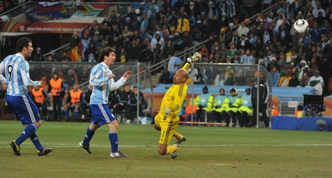 Argentina's striker Lionel Messi (2ndL) eyes the ball past Mexico's goalkeeper Oscar Perez (C) before Argentina's striker Carlos Tevez (unseen) scored the opening goal during the 2010 World Cup round of 16 football match Argentina vs. Mexico on June 27, 2010 at Soccer City stadium in Soweto, suburban Johannesburg. NO PUSH TO MOBILE / MOBILE USE SOLELY WITHIN EDITORIAL ARTICLE - AFP PHOTO / ROBERTO SCHMIDT