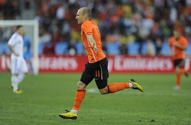 Arjen Robben celebrates after scoring the first goal for Holland