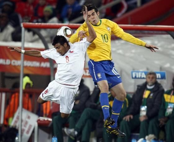 Chile's Arturo Vidal, left, jumps for the ball with Brazil's Kaka during the World Cup round of 16 soccer match between Brazil and Chile at Ellis Park Stadium in Johannesburg, South Africa, Monday, June 28, 2010. (AP Photo/Luca Bruno)