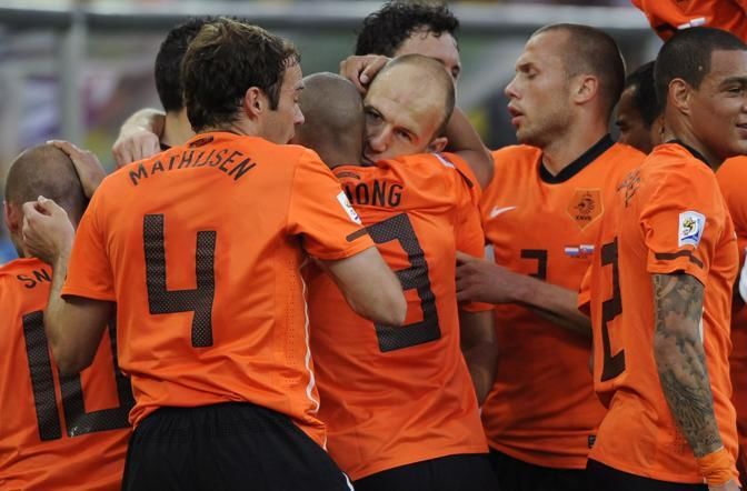 nella foto: Arjen Robben festeggia con i compagni dopo aver segnato il primo goal per l'Olanda