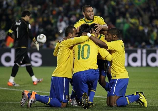 IPTC: Caption Brazil's Robinho, second from right, celebrates with fellow team members after scoring the third goal during the World Cup round of 16 soccer match between Brazil and Chile at Ellis Park Stadium in Johannesburg, South Africa, Monday, June 28, 2010. (AP Photo/Matt Dunham)