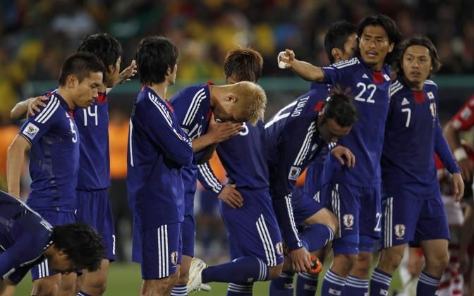 IPTC: Caption Japan's Keisuke Honda (5th L) prays before the start of penalty shootout in their 2010 World Cup second round soccer match against Paraguay at Loftus Versfeld stadium in Pretoria June 29, 2010. REUTERS/Eddie Keogh (SOUTH AFRICA - Tags: SPORT SOCCER WORLD CUP)