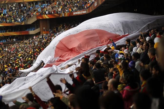 Japan's soccer fans hold up a giant Japanese flag before the World Cup round of 16 soccer match between Paraguay and Japan at the Loftus Versfeld Stadium in Pretoria, South Africa, Tuesday, June 29, 2010. (AP Photo/Jerome Delay)