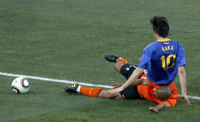 Brazil's Kaka falls on Netherlands' Nigel de Jong (bottom) during their 2010 World Cup quarter-final soccer match in Port Elizabeth July 2, 2010. REUTERS/David Gray (SOUTH AFRICA - Tags: SPORT SOCCER WORLD CUP)