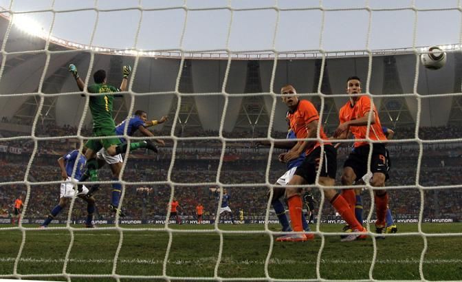 Netherlands' John Heitinga, second from right, and Netherlands' Robin van Persie, right, look at the ball go into the net after it touched Brazil's Felipe Melo, third from left, during the World Cup quarterfinal soccer match between the Netherlands and Brazil at Nelson Mandela Bay Stadium in Port Elizabeth, South Africa, Friday, July 2, 2010. (AP Photo/Julie Jacobson)