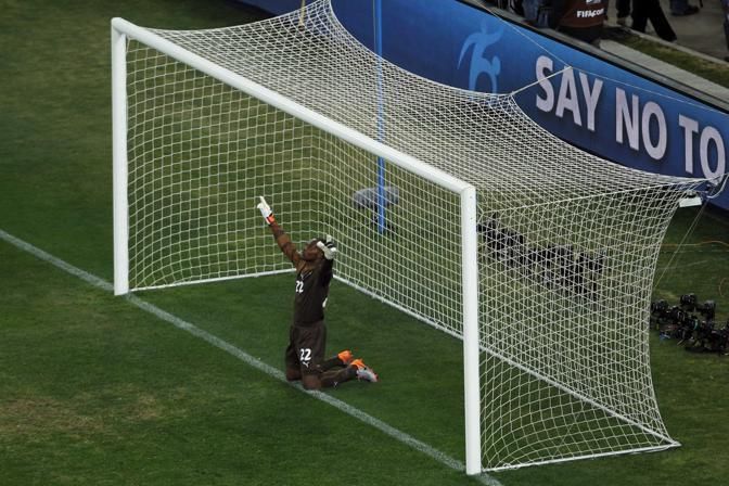 Ghana goalkeeper Richard Kingson prays prior to the World Cup quarterfinal soccer match between Uruguay and Ghana at Soccer City in Johannesburg, South Africa, Friday, July 2, 2010. (AP Photo/Hassan Ammar)