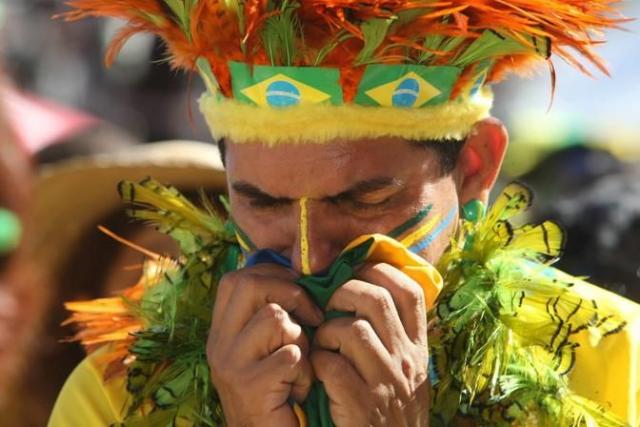 epa02233772 A Brazilian soccer fan reacts at the Fifa Fan Fest on the beach of Copacabana, Brazil, after being defeated by the Netherlands in the FIFA World Cup 2010 quarter final match at the Nelson Mandela Bay stadium in Port Elizabeth, South Africa, 02 July 2010. EPA/MARCELO SAYAO