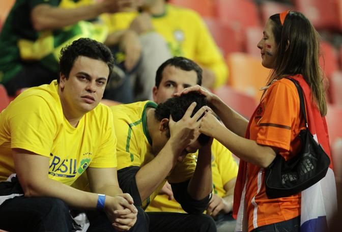 A Brazil supporter, center, is comforted by a Netherlands supporter following the World Cup quarterfinal soccer match between the Netherlands and Brazil at Nelson Mandela Bay Stadium in Port Elizabeth, South Africa, Friday, July 2, 2010. Netherlands defeated Brazil 2-1 on Friday, becoming the first semifinalist of the World Cup. (AP Photo/Matt Dunham)