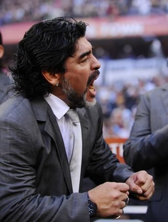 © Action Images/LaPresse 03/07/2010 Green Point Stadium, Cape Town sport calcio Mondiali Sudafrica 2010 Germania v Argentina nella foto: l'allenatore dell'Argentina Diego Maradona Only Italy Football - Germany v Argentina FIFA World Cup Quarter Final - South Africa 2010 - Green Point Stadium, Cape Town, South Africa - 3/7/10 Argentina coach Diego Maradona reacts during the match Mandatory Credit: Action Images / Jason Cairnduff Livepic