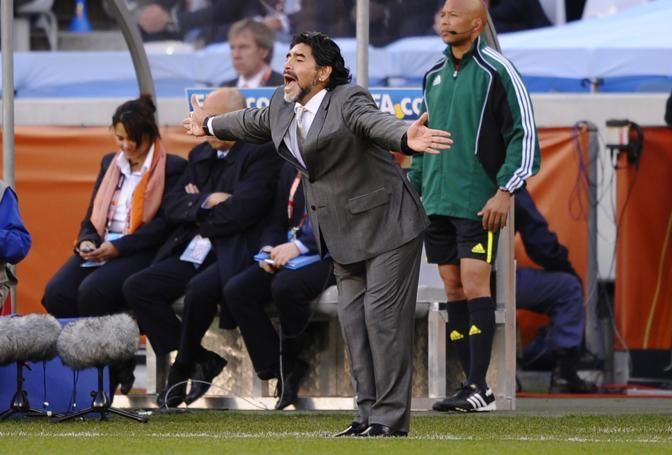 © Action Images/LaPresse 03/07/2010 Green Point Stadium, Cape Town sport calcio Mondiali Sudafrica 2010 Germania v Argentina nella foto: l'allenatore dell'Argentina Diego Maradona Only Italy Football - Germany v Argentina FIFA World Cup Quarter Final - South Africa 2010 - Green Point Stadium, Cape Town, South Africa - 3/7/10 Argentina coach Diego Maradona Mandatory Credit: Action Images / Jason Cairnduff Livepic