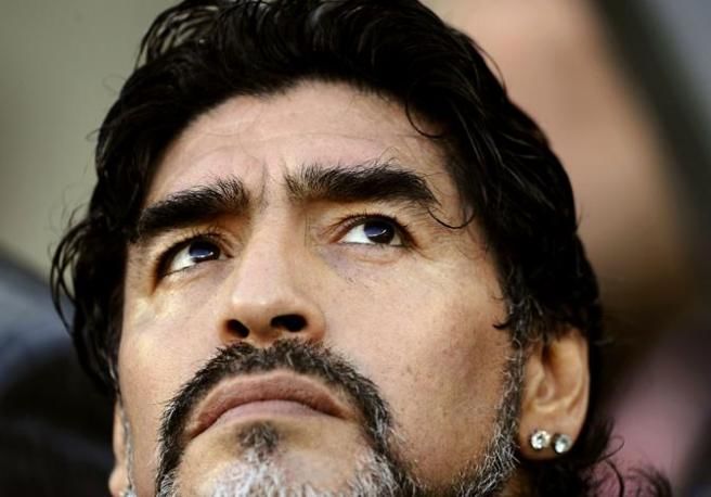 Argentina's coach Diego Maradona looks on before the 2010 World Cup quarter-final soccer match against Germany at Green Point stadium in Cape Town July 3, 2010. REUTERS/Dylan Martinez (SOUTH AFRICA - Tags: SPORT SOCCER WORLD CUP)