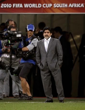 Argentina's coach Diego Maradona reacts after Germany won their 2010 World Cup quarter-final soccer match at Green Point stadium in Cape Town July 3, 2010. REUTERS/Darren Staples (SOUTH AFRICA - Tags: SPORT SOCCER WORLD CUP)