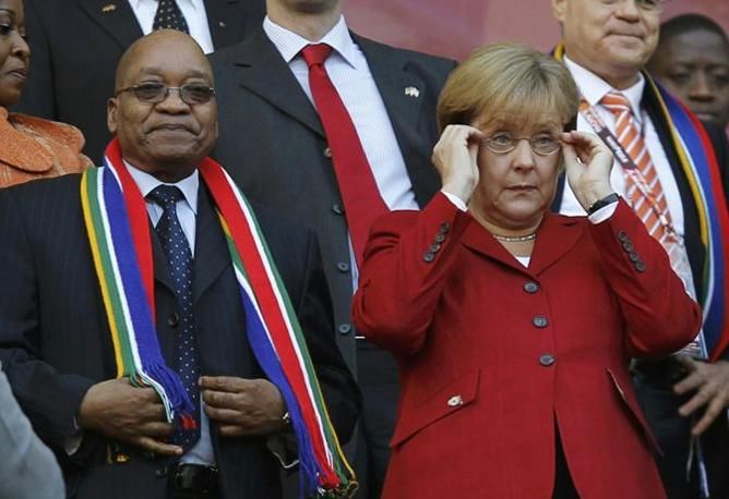 South Africa's President Jacob Zuma stands next to German Chancellor Angela Merkel before the 2010 World Cup quarter-final soccer match between Argentina and Germany at Green Point stadium in Cape Town July 3, 2010. REUTERS/Kai Pfaffenbach (SOUTH AFRICA - Tags: SPORT SOCCER WORLD CUP)