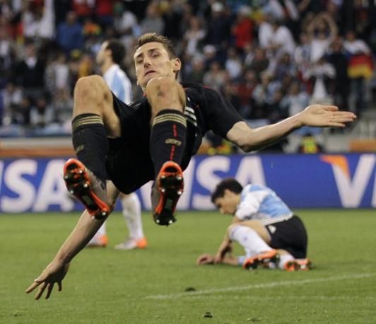 Germany's Miroslav Klose celebrates after scoring his team's fourth goal during the World Cup quarterfinal soccer match between Argentina and Germany at the Green Point stadium in Cape Town, South Africa, Saturday, July 3, 2010. Germany won 4-0. (AP Photo/Matt Dunham)