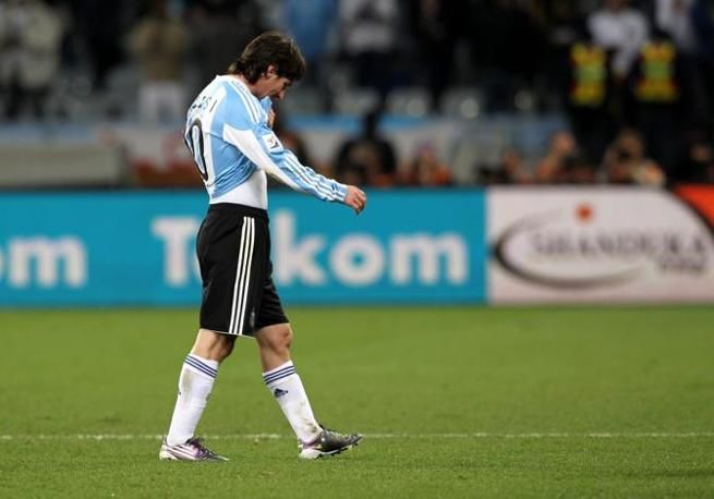 epa02235423 Argentina's Lionel Messi leaves the pitch after the FIFA World Cup 2010 quarter final match between Argentina and Germany at the Green Point stadium in Cape Town, South Africa, 03 July 2010. Germany beats Argentina 4-0. EPA/OLIVER WEIKEN Please refer to www.epa.eu/downloads/FIFA-WorldCup2010-Terms-and-Conditions.pdf