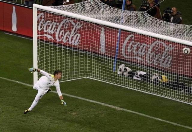Uruguay's goalkeeper Fernando Muslera dives but fails to save the shot on goal by Netherlands' Giovanni van Bronckhorst during their 2010 World Cup semi-final soccer match at Green Point stadium in Cape Town July 6, 2010. REUTERS/Oleg Popov (SOUTH AFRICA - Tags: SPORT SOCCER WORLD CUP)