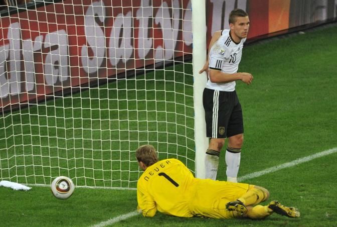 Germany's goalkeeper Manuel Neuer (L) eyes the ball after conceding a goal by Spain's defender Carles Puyol (unseen) during the 2010 World Cup semi-final football match Germany vs. Spain on July 7, 2010 at Moses Mabhida stadium in Durban. NO PUSH TO MOBILE / MOBILE USE SOLELY WITHIN EDITORIAL ARTICLE - AFP PHOTO / ROBERTO SCHMIDT