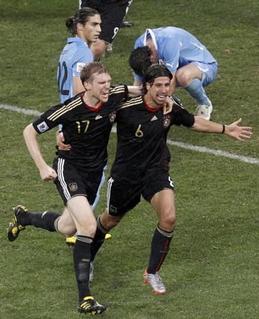 Germany's Sami Khedira (6) celebrates with team mate Per Mertesacker after scoring a goal during their 2010 World Cup third place playoff soccer match against Uruguay in Port Elizabeth July 10, 2010. REUTERS/Oleg Popov (SOUTH AFRICA - Tags: SPORT SOCCER WORLD CUP)