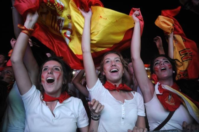 Spanish fans celebrate a goal during a public screening of the soccer World Cup final against the Netherlands at the Plaza de Castilla in Pamplona July 11, 2010. REUTERS/Vincent West (SPAIN - Tags: SPORT SOCCER)