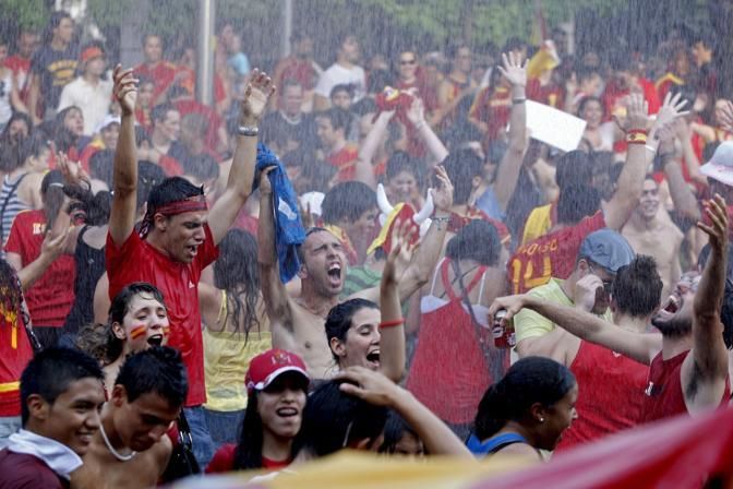 epa02245270 Thousands of supporters refresh themselves while waiting for the match to start at the Paseo de Recoletos in Madrid, Spain, 11 July 2010. Followers have gathered in the centre of Madrid to watch on the giant screen the match between the Netherlands and Spain at the World Cup soccer final in Johannesburg, South Africa. EPA/Kote Rodrigo