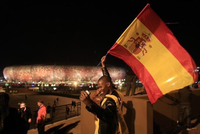 A supporter of Spain waves a flag as he rushes to the Soccer City stadium during the closing ceremony of the 2010 World Cup in Johannesburg July 11, 2010. REUTERS/Radu Sigheti (SOUTH AFRICA - Tags: SPORT SOCCER WORLD CUP)
