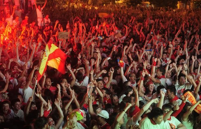 San Fermin revelers celebrate at Pamplona's Plaza del Castillo a live broadcast of the World Cup soccer final, which is being played in South Africa, after Spain's defeated the Netherlands 1-0 on Sunday, July 11, 2010. (AP Photo/Manu Fernandez)