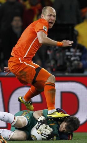 Spain's goalkeeper Iker Casillas (bottom) saves Netherlands' Arjen Robben's shot at goal during their 2010 World Cup final soccer match at Soccer City stadium in Johannesburg July 11, 2010. REUTERS/Marcos Brindicci (SOUTH AFRICA - Tags: SPORT SOCCER WORLD CUP IMAGE OF THE DAY TOP PICTURE)