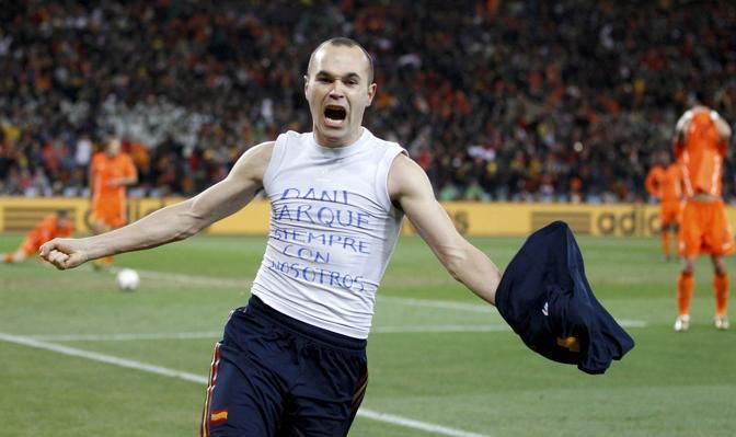 Spain's Andres Iniesta (R) celebrates scoring a goal during their 2010 World Cup final soccer match against Netherlands at Soccer City stadium in Johannesburg July 11, 2010. REUTERS/Jerry Lampen (SOUTH AFRICA - Tags: SPORT SOCCER WORLD CUP)
