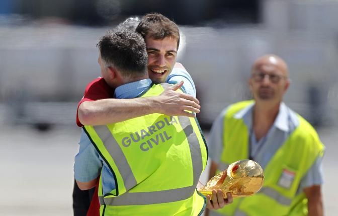 Spain's captain Iker Casillas hugs a policeman holding the World Cup trophy after arriving at Madrid's Barajas airport on Monday, July 12, 2010. Spain won the World Cup after defeating the Netherlands 1-0 on Sunday. (AP Photo/Armando Franca)
