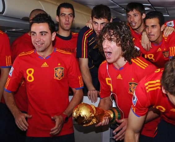 Spain's defender Carles Puyol (C) and Spain's midfielder Xavi Hernandez (L) celebrate on the plane before their arrival at Barajas' airport on July 12, 2010 in Madrid, a day after winning the World Cup for the first time 1-0 against Holland. Over one million fans are expected to line the streets of Madrid to watch as the Spanish squad parades through main streets on a open top bus. AFP PHOTO / LLUIS GENE
