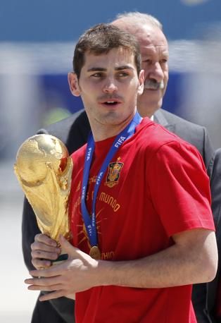 IPTC: Caption Spain's captain Iker Casillas gestures with the World Cup trophy next to coach Vicente del Bosque, background, after arriving at Madrid's Barajas airport on Monday, July 12, 2010. Spain won the World Cup after defeating the Netherlands 1-0 on Sunday. (AP Photo/Armando Franca)