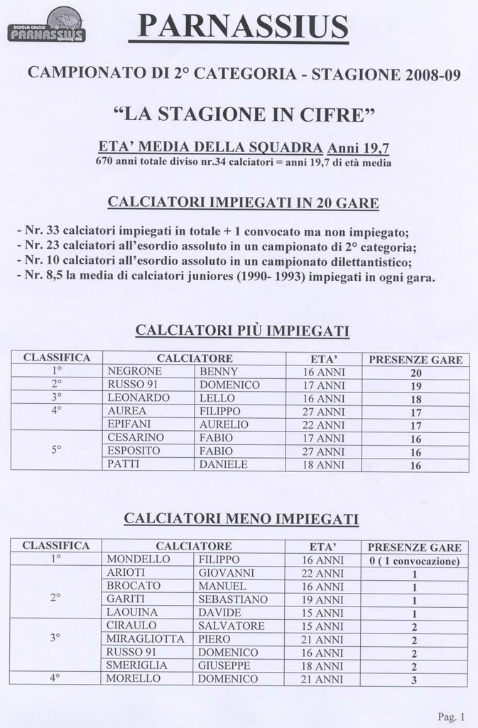 LA STAGIONE IN CIFRE 2 CATEGORIA 2008 - 2009